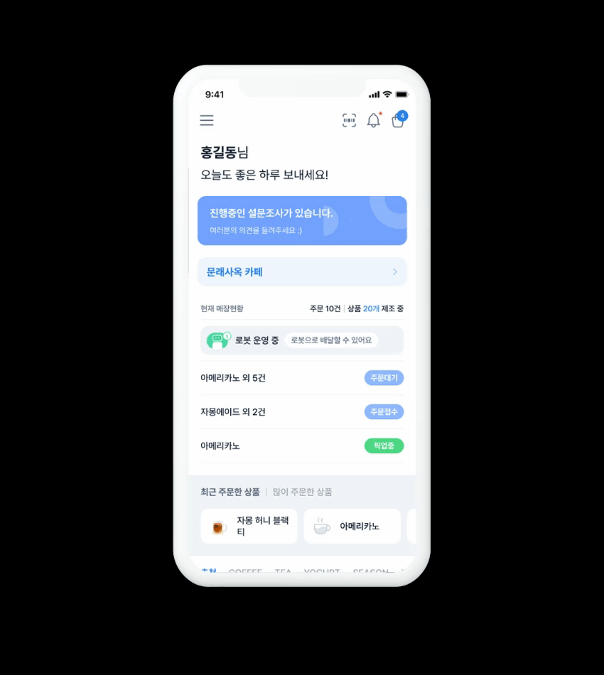 바쁜 업무로 카페 방문이 어렵다면 로봇배달을 이용해 상품을 받아볼 수 있어요.
