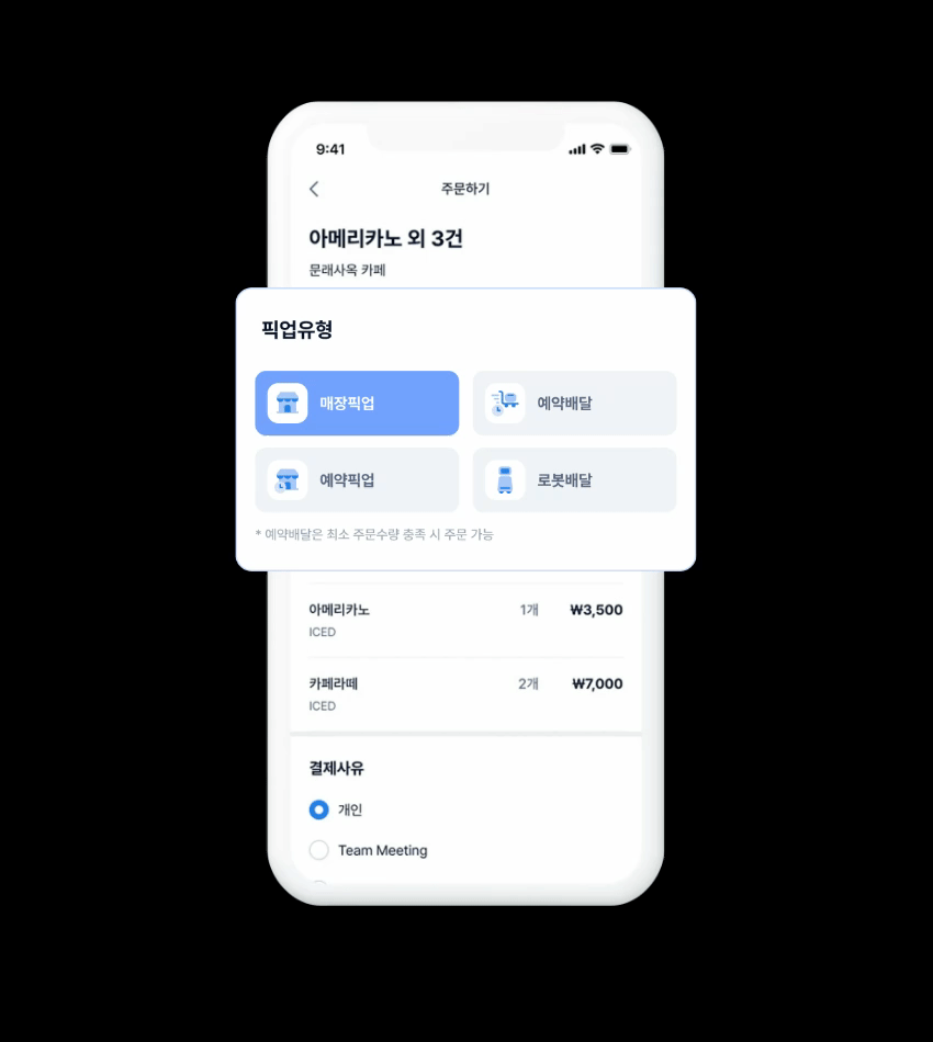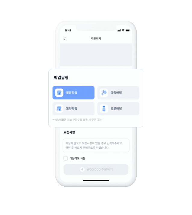 APP 주문에서는 다양한 픽업유형을 선택할 수 있어요.